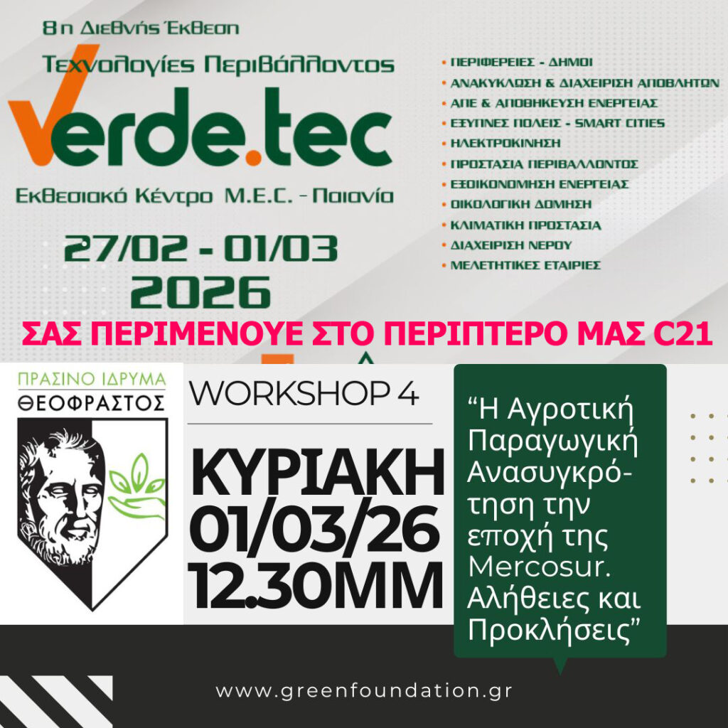 Για μία ακόμη χρονιά το Πράσινο Ίδρυμα “Θεόφραστος” συμμετέχει δυναμικά στην 8η διεθνή έκθεση Verde.tec: Τεχνολογίες Περιβάλλοντος. Η Έκθεση θα πραγματοποιηθεί από τις 27 Φεβρουαρίου 2026 έως την 1η Μαρτίου 2026 στο εκθεσιακό κέντρο MEC στην Παιανία.