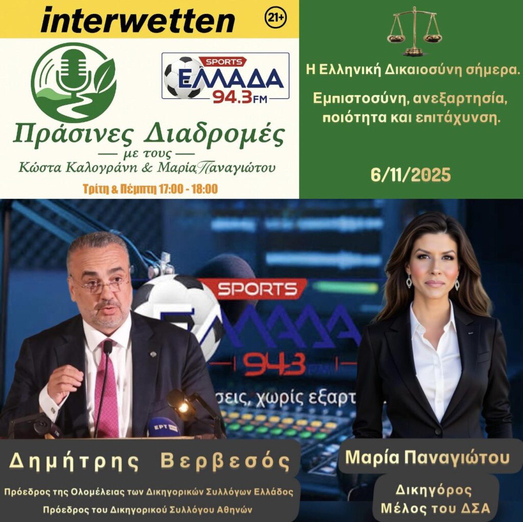 Η Ελληνική Δικαιοσύνη στο μικροσκόπιο των ΠΡΑΣΙΝΩΝ ΔΙΑΔΡΟΜΩΝ, σήμερα, στον interwetten ΕΛΛΑΔΑ 94,3 FM
