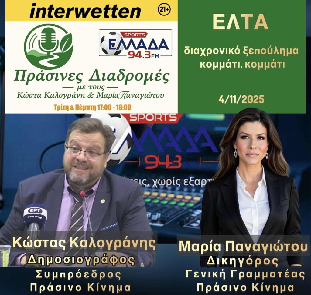 Συγκεκριμένα, κάθε Τρίτη και Πέμπτη από τις 17.00 έως τις 18.00 στη φιλόξενη συχνότητα του interwetten ΕΛΛΑΔΑ 94,3 FM ο Συμπρόεδρος του Πράσινου Κινήματος Κώστας Καλογράνης παρουσιάζει την εκπομπή “Πράσινες Διαδρομές”. Μαζί του η γενική γραμματέας του Πράσινου Κινήματος, Μαρία Παναγιώτου. Τις οικολογικές ειδήσεις της εβδομάδας επιμελείται και παρουσιάζει η Συμπρόεδρος του Πράσινου Κινήματος, Έλενα Χορέβα.
